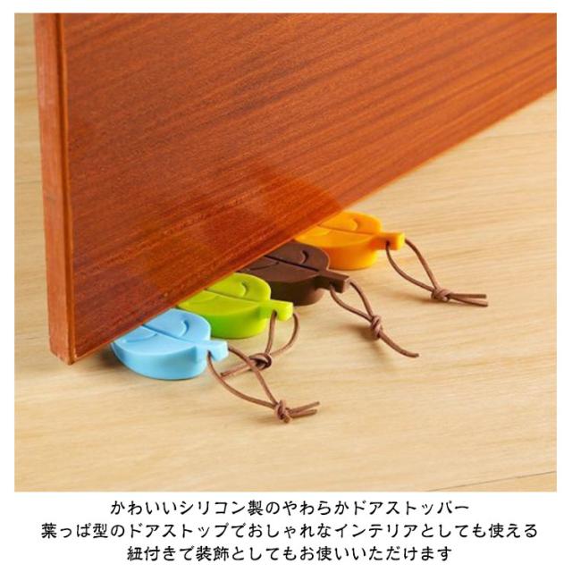 | 葉っぱの形がおしゃれ 便利なひも付き ドアストッパー 【8個セット】 4色展開 かわいいシリコン製のやわらかドアストッパー 葉っぱ型のドアストップでおしゃれなインテリアとしても使える 紐付きで装飾としてもお使いいただけます 〇葉っぱの形がおしゃれかつかわいい ドアストッパーです。 置いておくだけでもインテリアグッズとして おしゃれな空間を作ることができます。 〇シリコン製のため、やわらかく、使いやすいため、 様々なドアに幅広く活用できます。 また、ドアを傷つける危険もありません。 〇ドア下の隙間5-20mmで使用可能です。 〇ひも付きですので紛失防止にもなり、 管理、収納もしやすいです。 | |
