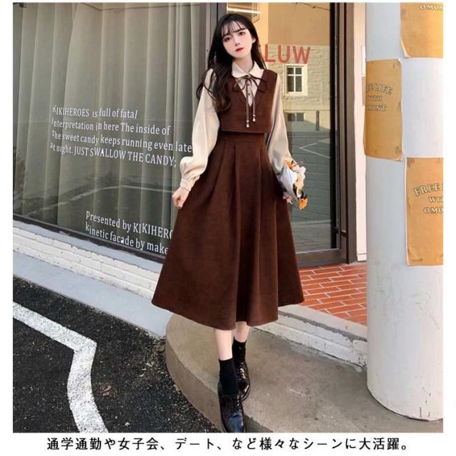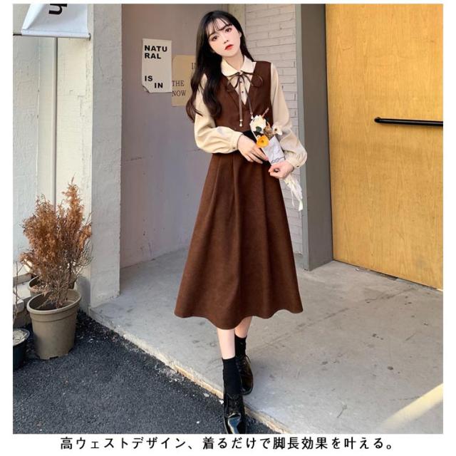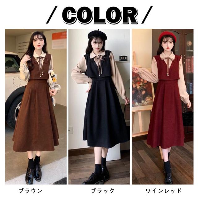 レトロ ワンピース 春秋 春秋 通勤 ロングワンピース 長袖ワンピース 秋 かわいい 膝下丈 冬 長袖 ロング丈 フレアワンピース 女子高校生 送料無料 フェイクレイヤード レディース 着痩せ 通学 可愛い 女子 重ね着風 体型カバー