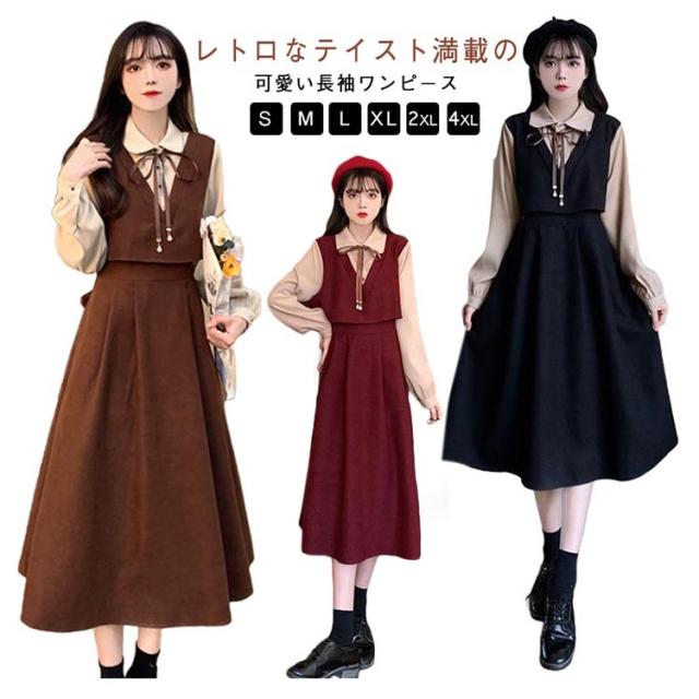 ワンピース 春秋 長袖ワンピース ロングワンピース かわいい ロング丈 レトロ 着痩せ 秋 膝下丈 女子高校生 長袖 フェイクレイヤード フレアワンピース ワンピース 送料無料 春秋 レディース 通勤 通学 可愛い 女子 重ね着風 体型カバー