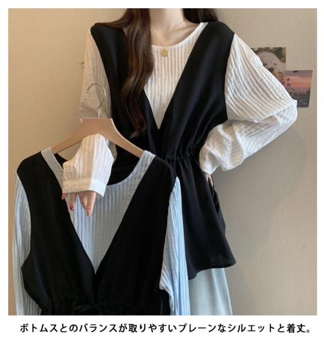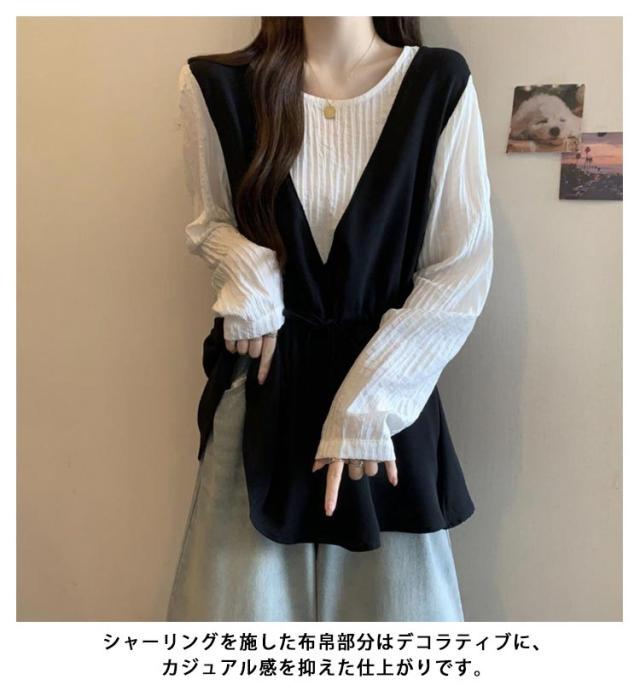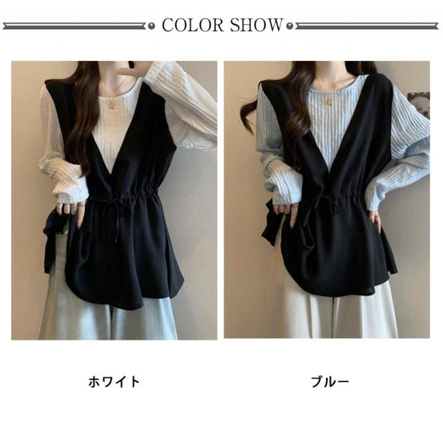 重ね着風Tシャツ トップス チュニック 長袖 ブラウス トップス 長袖シャツ レイヤード 着痩せ プルオーバー ベスト 重ね着風Tシャツ カットソー ラウンドネック シンプル カジュアル 秋 春 ツーピース風 通勤服 ブルー