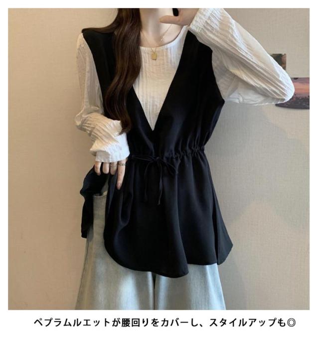 | 重ね着風のデザインがおしゃれなドッキングトップス。 ベスト風のデザインでコンパクトな印象を与えてくれるため、着痩せ効果抜群です。 シャーリングを施した布帛部分はデコラティブに、カジュアル感を抑えた仕上がりです。 ボトムスとのバランスが取りやすいプレーンなシルエットと着丈。 ペプラムルエットが腰回りをカバーし、スタイルアップも◎ 合わせるボトムス次第で、オン・オフ両方使える便利なアイテムです。 | |