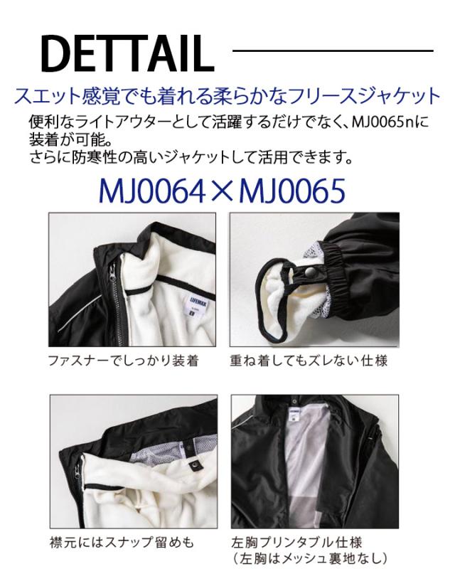 | 説明 特徴 | MJ0065 フリージャケットはMJ0064 ハイブリットジャケットの羅いいなーとして装着が可能。 アウターとインナーの色の組み合わせも自由にセレクトできます。どんなアイテムとも好相性で活躍の幅も広がります。 |