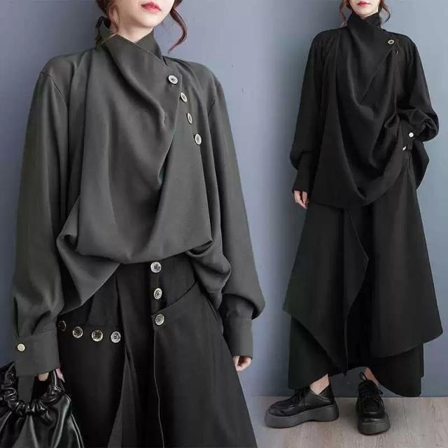 ブラウス レディース 長袖 シャツブラウス 襟ボタン付き トップス 長袖 モード系 個性的 無地 ハイネック 着回し コーディネート pLegLad店 大人 きれいめ 春 秋 通勤 ゆったり 大きいサイズ 40代 30代 50代 黒