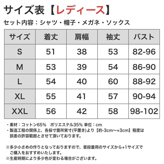 レディースのセット内容:Tシャツ、帽子、眼鏡、ソックス
