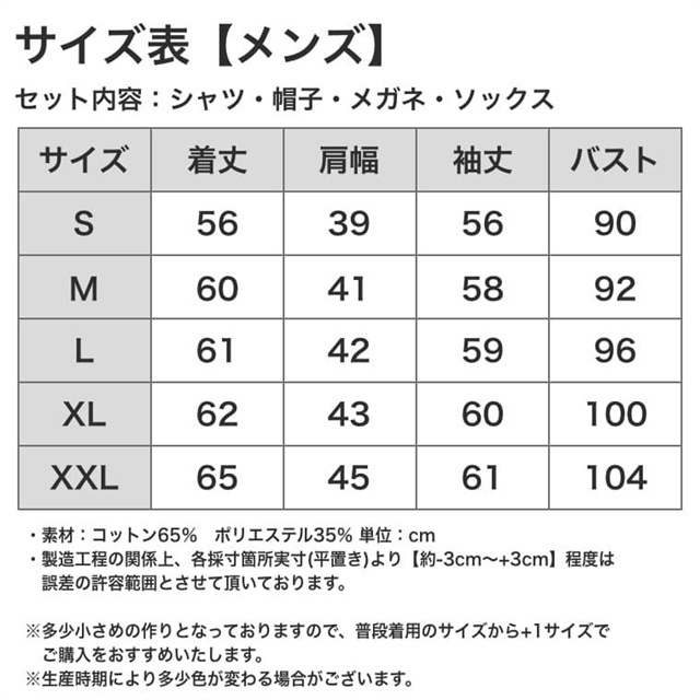 メンズのセット内容:Tシャツ、帽子、眼鏡
