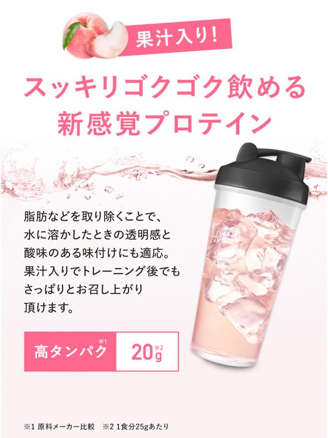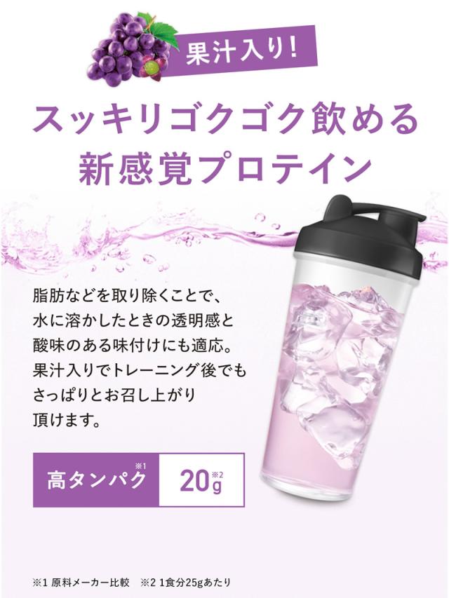スッキリゴクゴク飲める新感覚プロテインパウダー。スッキリジューシーなアセロラ味、マスカット味、ピーチティー味、ぶどう味[約16〜32回分]。