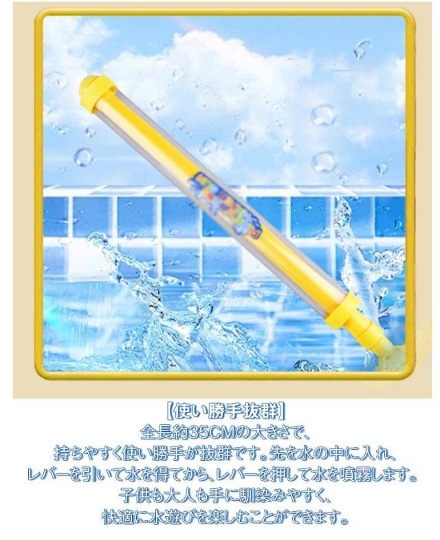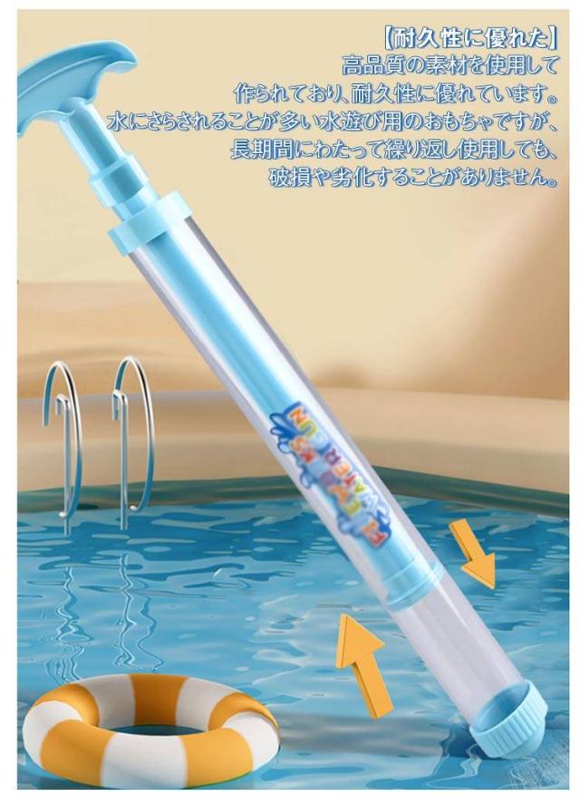 | 【花火のような水鉄砲 3個セット】 超強力な性能を備えており、水を花火のように勢いよく撃ち出します。夏の定番の水遊びに最適なおもちゃで、水ピストルとしての威力は子供から大人まで楽しめます。 【耐久性に優れた】 高品質の素材を使用して作られており、耐久性に優れています。水にさらされることが多い水遊び用のおもちゃですが、長期間にわたって繰り返し使用しても、破損や劣化することがありません。 【使い勝手抜群】全長約35cmの大きさで、持ちやすく使い勝手が抜群です。先を水の中に入れ、レバーを引いて水を得てから、レバーを押して水を噴霧します。 子供も大人も手に馴染みやすく、快適に水遊びを楽しむことができます。 【親子で楽しめる】 軽量でコンパクトで、触り心地が良いので、お子様が握りやすくなっています。 プールとビーチに行って、すぐに暑さを吹き飛ばしましょう! 【多様なシーンで活躍する】 バスタブ、ビーチ、スイミングプール、公園、学校などで大成功を収めることでしょう。 暑さ対策としても最適で、涼しさを取り戻すことができます。 | |