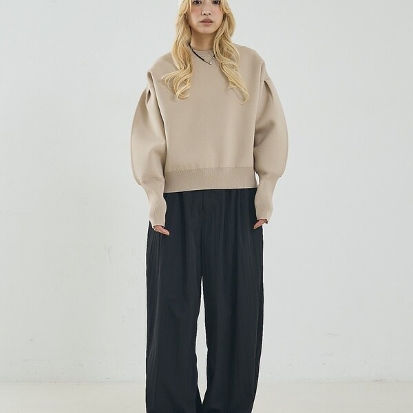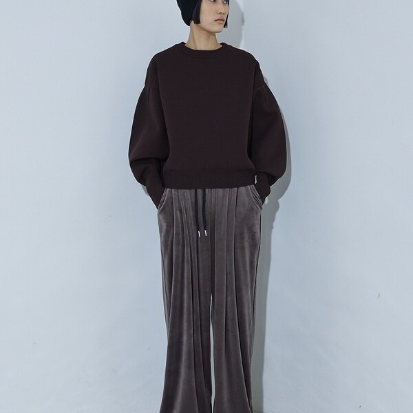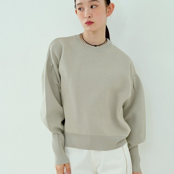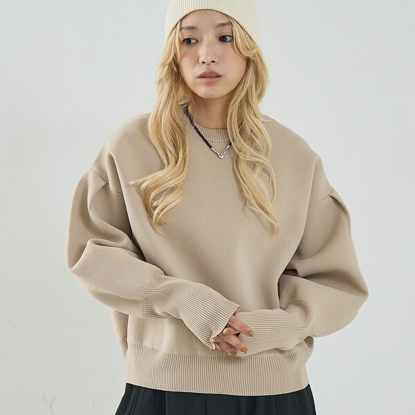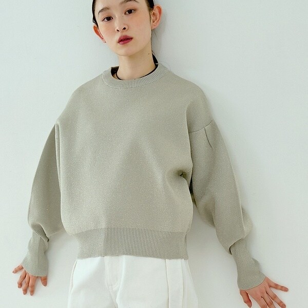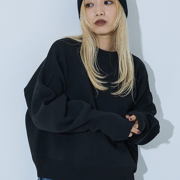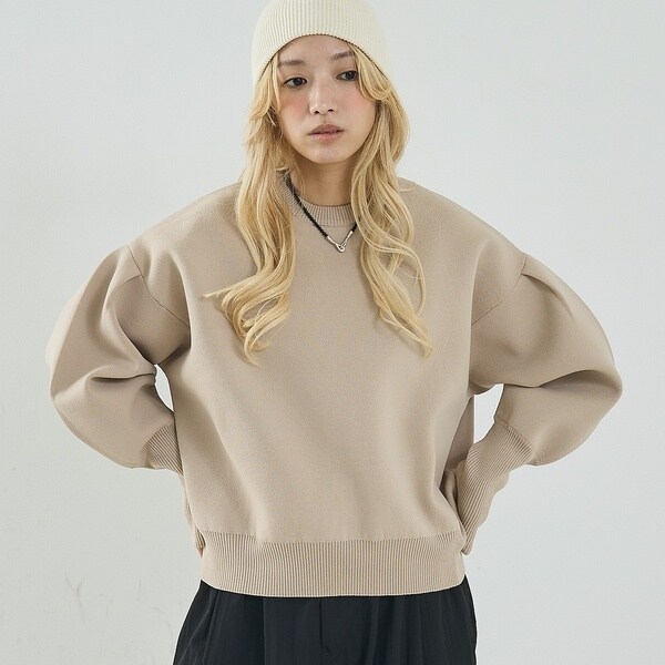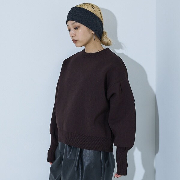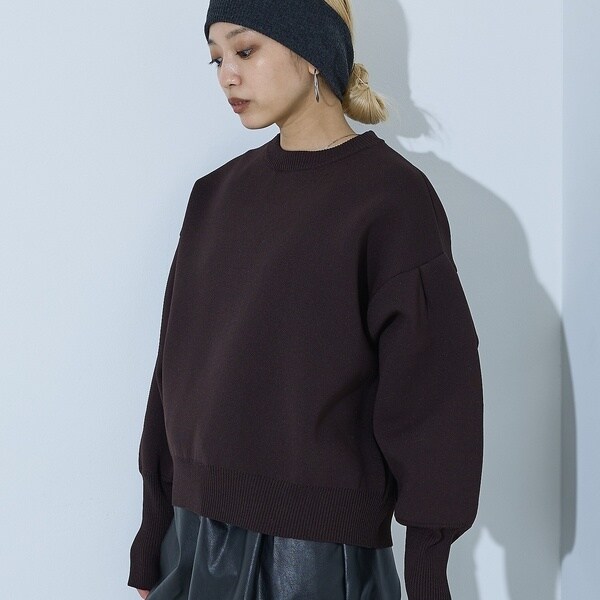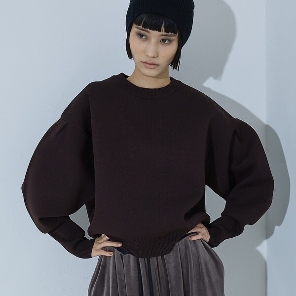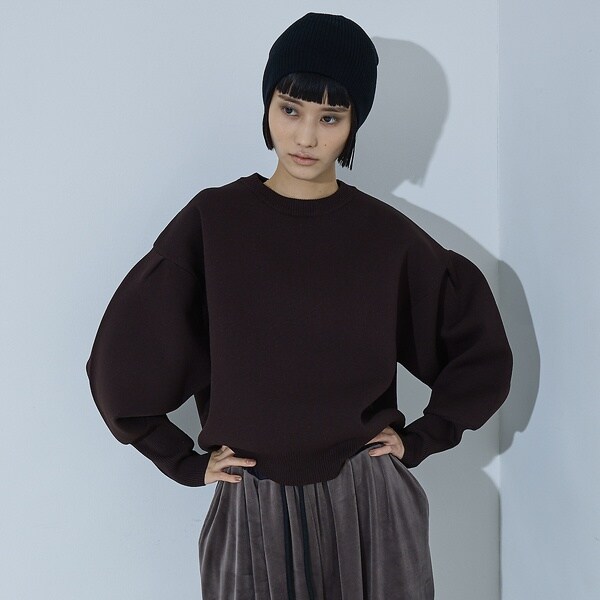 立体的な袖のシルエットが目を引く、スウェットライクな表情のニット。