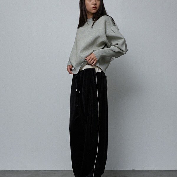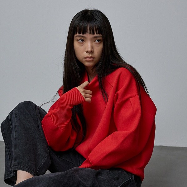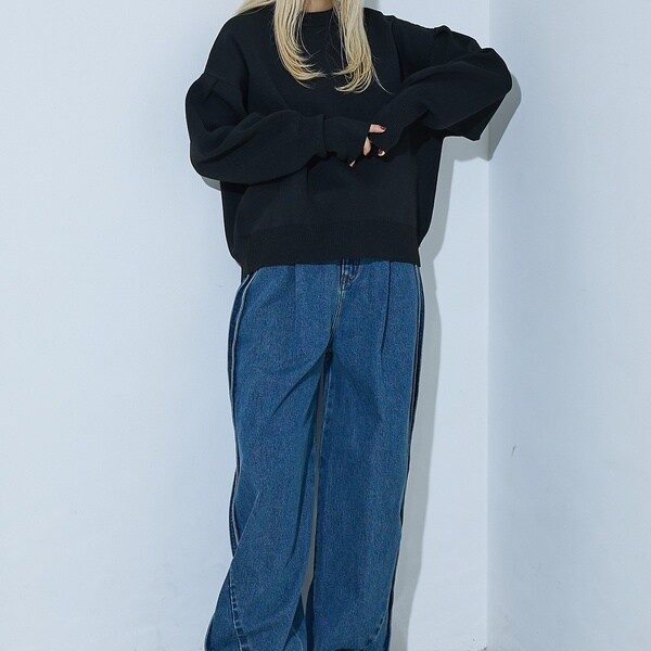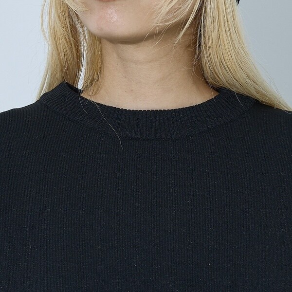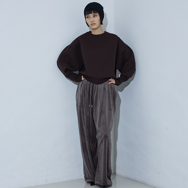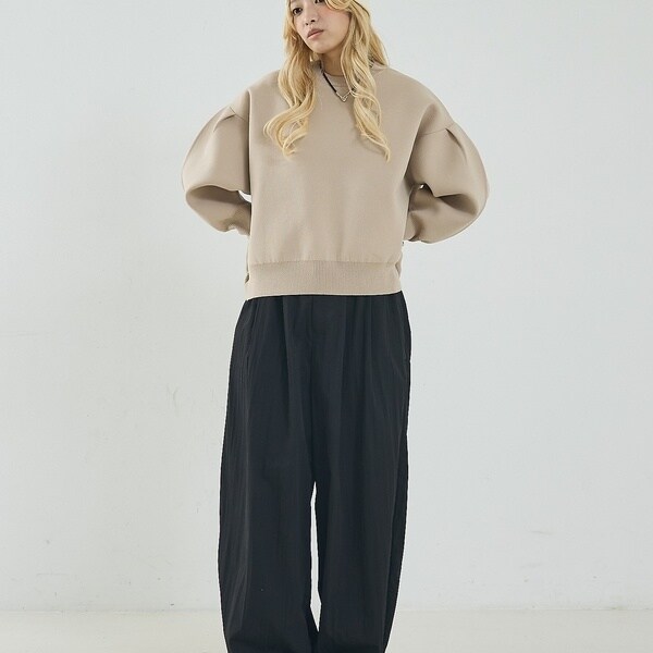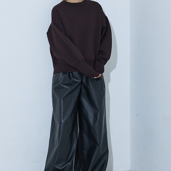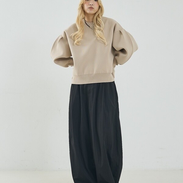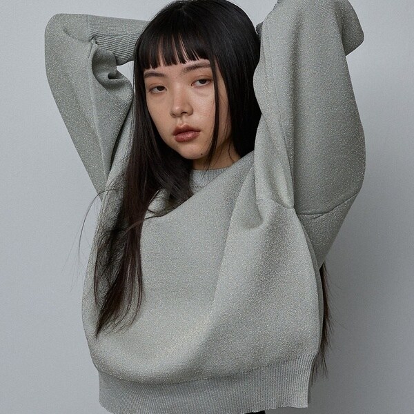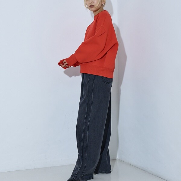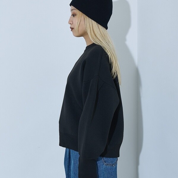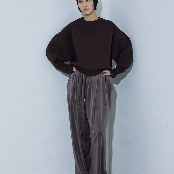 立体的な袖のシルエットが目を引く、スウェットライクな表情のニット。