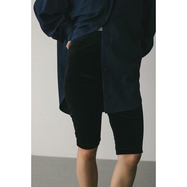 モデル身長165cm(Mサイズ着用)柔らかく履き心地の良いカットベロア素材を使用したバイカーパンツ。オーバーサイズなジャケットやシャツ等、かっちりしたものにあわせてもラフなこなれ感が演出できる一枚。シンプルでありながら存在感を放つ、シーズンムードを高めてくれるアイテムです。透け感なし、ストレッチあり。【お手入れ方法】マシンウォッシュ可