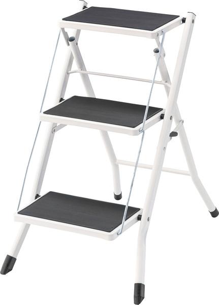 ●大人が乗ってもしっかりと支えてくれる、耐荷重量の踏み台。ステップ部分に乗ったまま物を取ったり、電球を変えたりするなどの軽作業も安心して行なうことが出来ます。ステップ台 踏み台 3段 折りたたみ おしゃれ 滑りにくい スリム コンパクト スチール 軽量 持ち運び グリップ付き ノンスリップ 収納 ディスプレイ 簡易チェア チェア スツール ホワイト