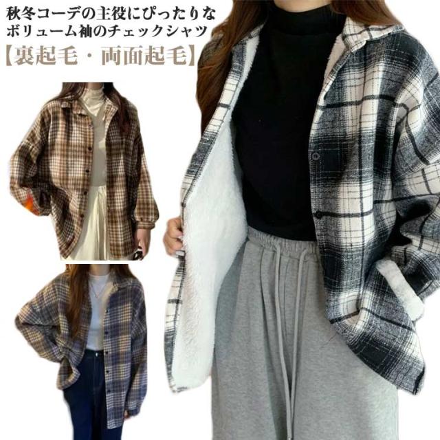 アウター 羽織り ネルシャツ ボリューム袖 暖かい チェックシャツ ブラウス 秋 シャツジャケット 両面起毛 厚手 ゆったり 裏起毛 冬 レディース オーバーサイズ あったか 長袖シャツ
