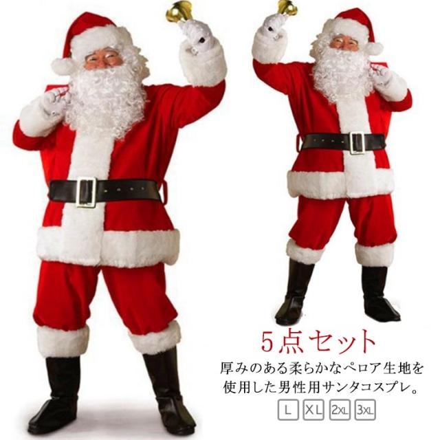 男性用 サンタ 仮装 コスプレ クリスマス サンタ衣装 5点セット ぺロア生地 大人 もこもこ 衣装 コスチューム 大きいサイズ 長袖 パンツ サンタ帽子 サンタクロース ふわふわ ひげ
