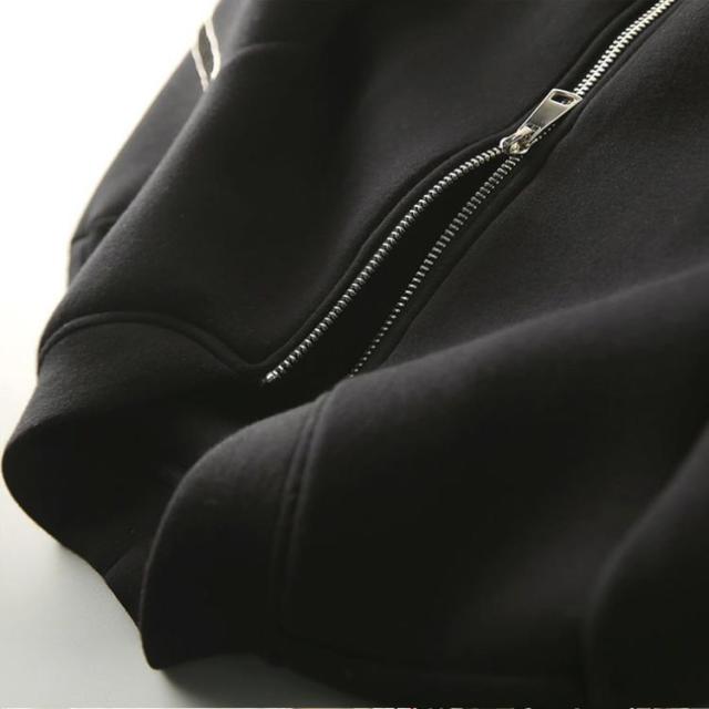 袖にあしらったクロスラインが特徴のノーカラーパーカー。