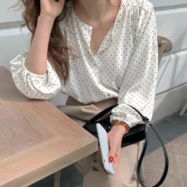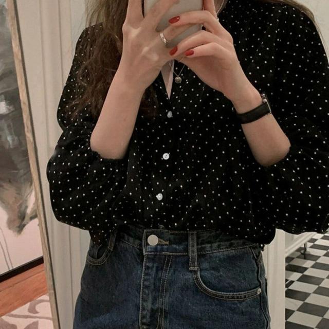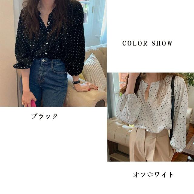 水玉トップス パフスリーブ ゆるシャツ オフィスカジュアル 韓国風 ブラウス 体型カバー 万能シャツ 春秋 着やせ女性らしいフェミニンなドット柄ブラウス