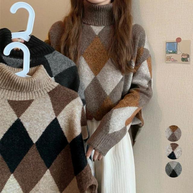 レディース ハイネック ニットセーター 秋冬 ニットプルオーバー カジュアル 韓国ファッション あたたか ニットウエア配色感はレトロな雰囲気が漂うアーガイル柄タートルネックニットトップス