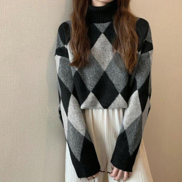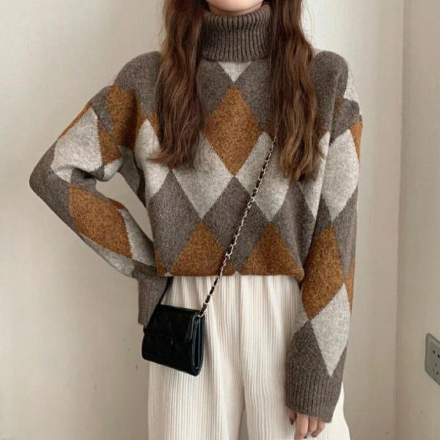 タートルネックニットトップス アーガイル レディース ハイネック ニットセーター 秋冬 ニットプルオーバー 韓国ファッション あたたか ニットウエア カジュアル