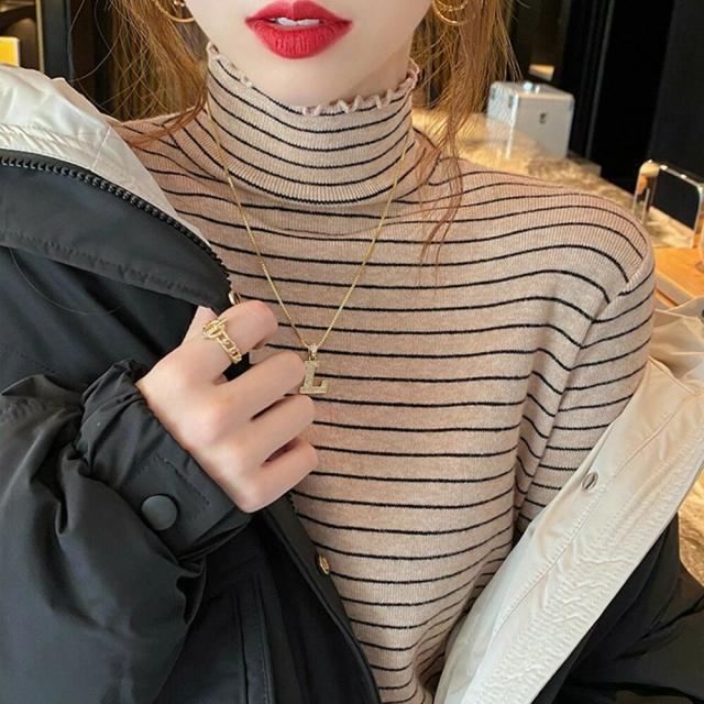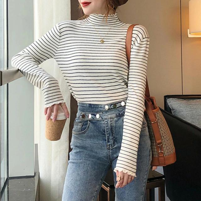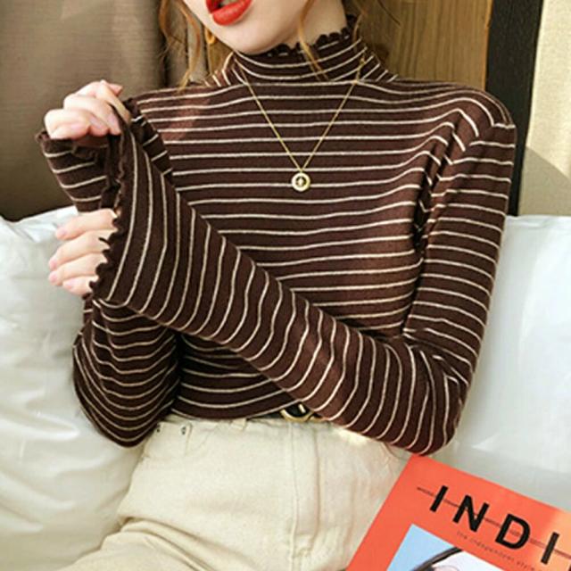 ボーダー柄ニットトップス 韓国ハイネッ レディースファッション 早い者勝ち ブラウン ブラック ベージュ ホワイト