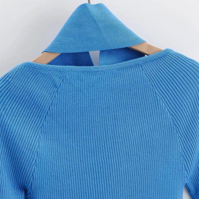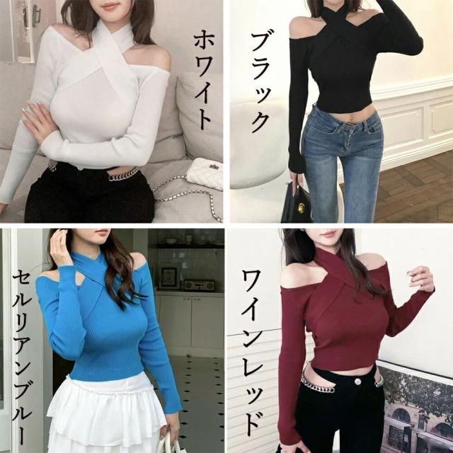 ショート丈トップス へそ出し リブニット ホルターネック 肩出し セクシー ニットトップス 大人カジュアル 韓国ファッション 春秋冬 鎖骨見せ 長袖 着やせ