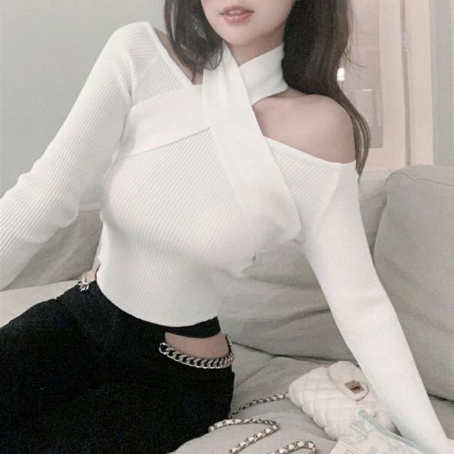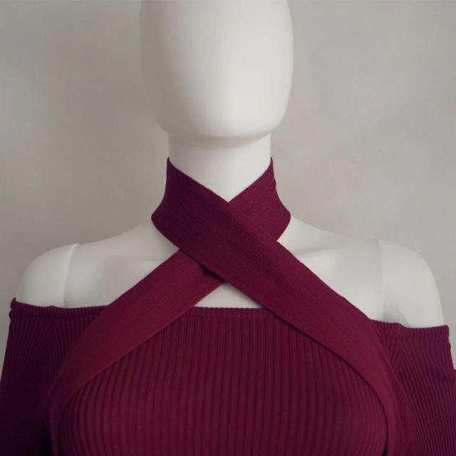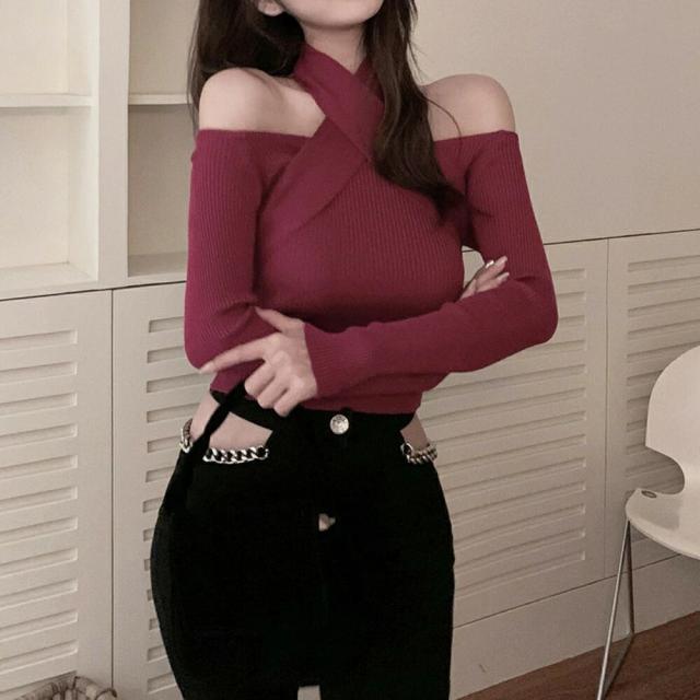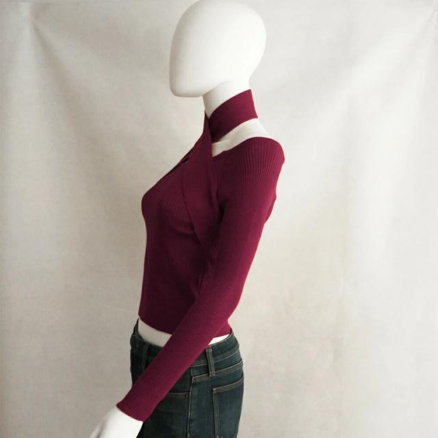 ホルターネック 肩出し セクシー ニットトップス 大人カジュアル 韓国ファッション 着やせ 春秋冬 鎖骨見せ 長袖大人っぽい雰囲気で着こなせるホルタ—ネックのニットトップス