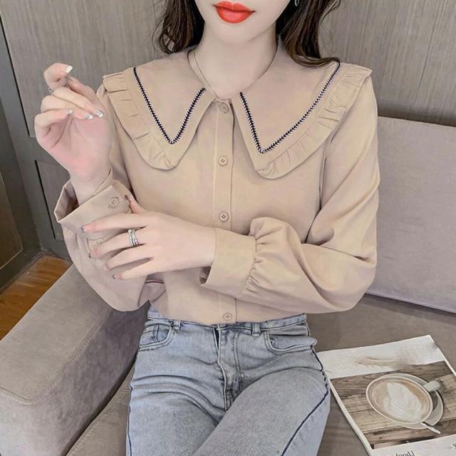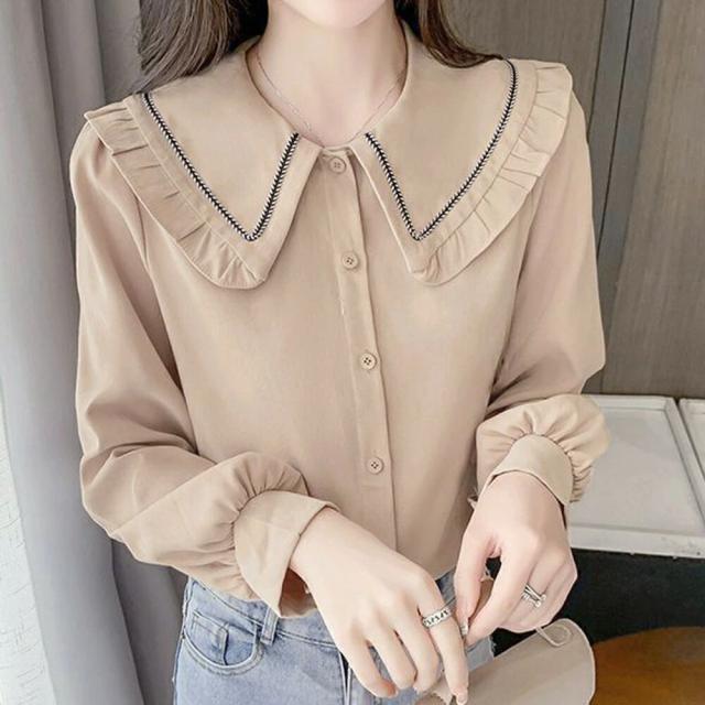 シャツブラウス フリル襟 ビッグカラー レディーストップス セーラーカラー 大人可愛い 長袖ブラウス オフィスカジュアル 襟付きシャツ フロントボタン 前開き