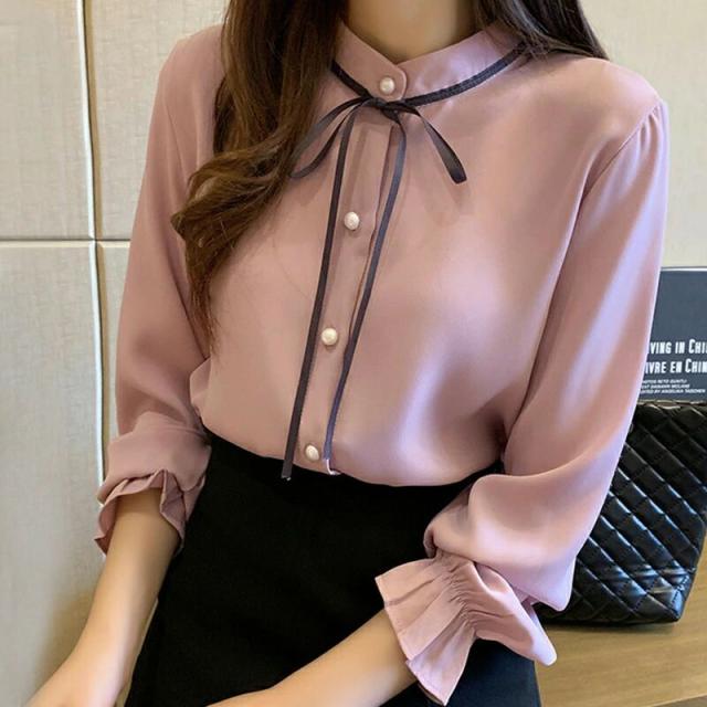 ブラウス ボウタイ 長袖 リボン ハイ レディースファッション 超目玉商品 S M L XL 2XL ブルー ホワイト ピンク
