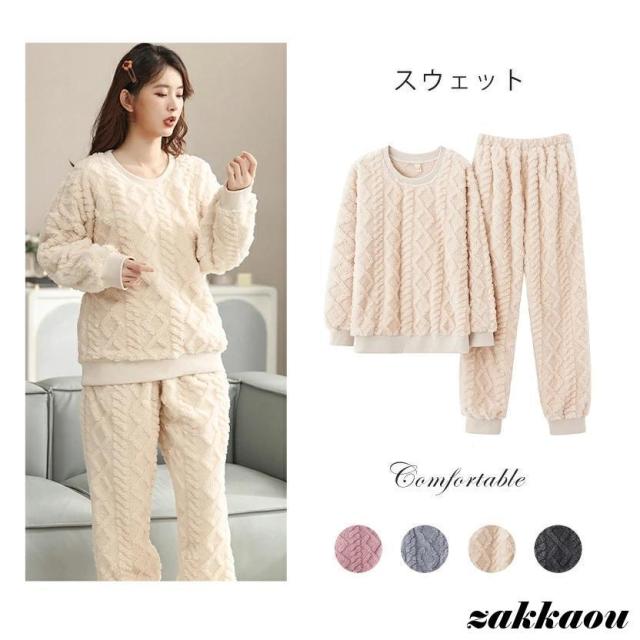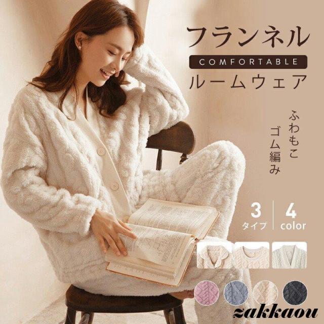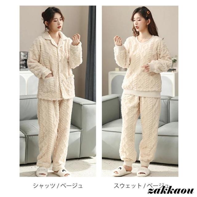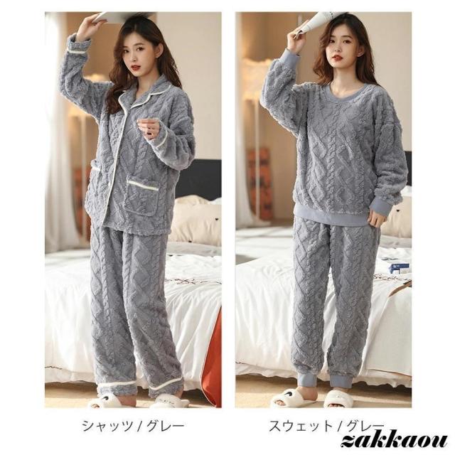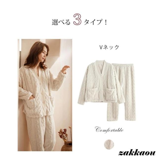 ルームウェア 上下セット 冬 パジャマ レディース 長袖 もこもこ かわいい 裏起毛 前開き あたたか ストレート Vネック 部屋着 着る毛布 裾絞り