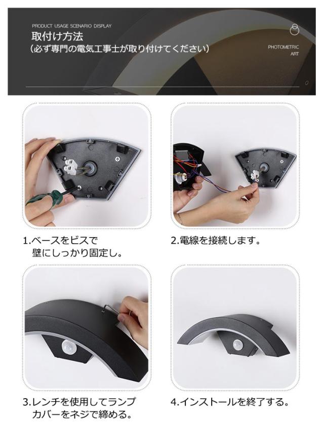 | 人感センサーライト。IP65防水レベル!防雨/防雪あらゆる厳しい天候でも耐えます。 人感センサー!夜間、人が近づくとセンサーが反応して点灯します。 人感・明るさセンサー内蔵/省エネ壁面取付ポーチライトは昼間はオンになりません。夜間、人が近づくとセンサーが反応して点灯します。80%のエネルギーを節約できます。点灯中に再度人の動きを検知すれば点灯し続けます。人が感知範囲をれると、45秒後に消灯します。IP65級防水材料を採用した、高等級の防水性を持たせているので全天候が対応できます。雪でも雨でも天候の悪い日でも安心できます。 高品質・シンプルデザイン高品質の素材アルミニウムとアクリルで作られ、優れた塗装加工技術で構成されています。酸化しにくく、色あせしません。環境にやさしいで作られており、耐久性があります。モダンなシンプルな形状と北欧風のデザイン、外観は特別でエレガントに見えます、見た目も美しく、着心地も丈夫。 適用場合&安心サポートブラケットライトは防水IP65ので、屋外用。玄関やポーチにやさしい光を届けてくれます。玄関、門柱、ガーデン、バー、カフェー、ギャラリー、縁側、通路や家の周りの防犯など様々なシーンで大活躍。 取付け方法 (必ず専門の電気工事士が取り付けてください) 1.ベースをビスで壁にしっかり固定し。 2.電線を接続します。 3.レンチを使用してランプカバーをネジで締める。 4.インストールを終了する。 | |