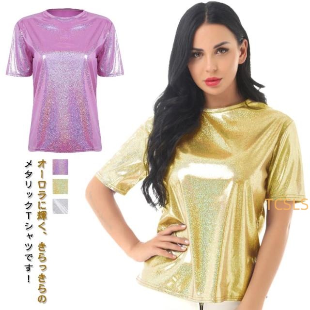 ダンス ラメTシャツ tシャツ レディース クルーネック トップス ステージ衣装 半袖 キラキラTシャツ トップス ステージ衣装 カットソー 衣装 ラメ ヒップホップ ジャズダンス 光沢 シルク調 キラキラ プルオーバー ラメ風 無地 可愛い