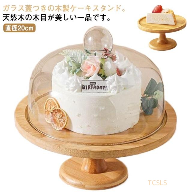 ケーキスタンド 直径20cm 結婚式 直径20cm 1段 ケーキスタンド 木 パーティー ケーキトレー ケーキ ディスプレイ 小 台付き 製菓 デザート スタンド 木製 ガラス蓋 硝子蓋 ナチュラル 木目調 おしゃれ 北欧 アフタヌーンティー 蓋付き