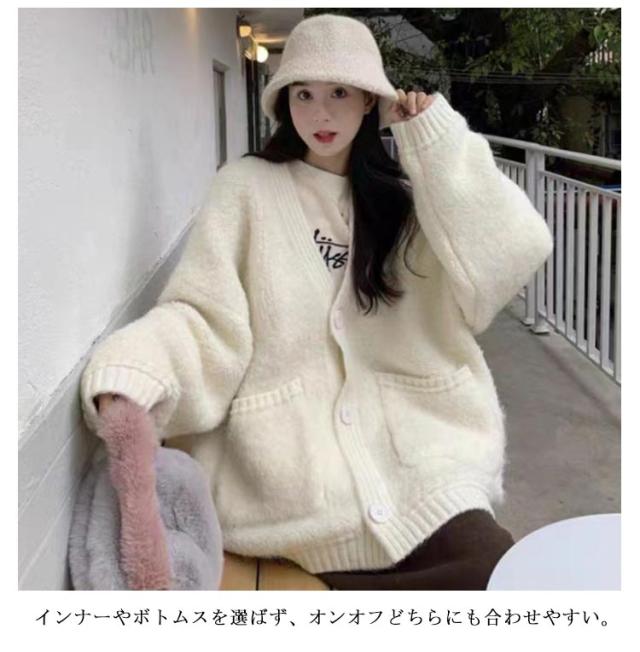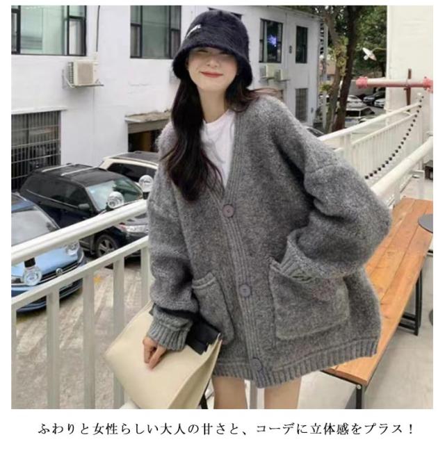 | トレンドライクなコーディネートが完成するふわふわのカーディガン ふわりと女性らしい大人の甘さと、コーデに立体感をプラス! インナーやボトムスを選ばず、オンオフどちらにも合わせやすい。 大きめボタンと、ざっくり開いたVネックで大人の抜け感演出。 | |