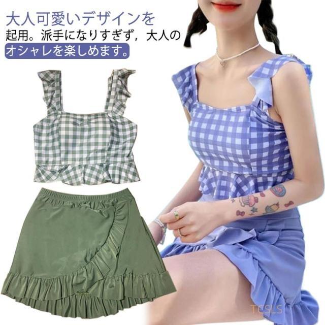セパレート レディース 水着 中学生 チェック柄 フリル 可愛い 大きいサイズ 高校生女子 可愛い 中学生 潜水 パッド付き 10代 20代 高校生 体型カバー 海水浴 2点セット 海 ビーチ 韓国 可愛い レディース 大きいサイズ 女の子