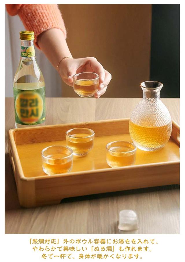 | サイズについての説明 | セット内容:おちょこ×4個、徳利×1個(コルク栓付き)、燗器×1個 おちょこ:4x5.3cm/重量76g/容量40ml 徳利:口径4.5cm、高さ12.5cm/重量120g/容量310ml 燗器:11.5x9.2cm/重量480g/容量620ml |