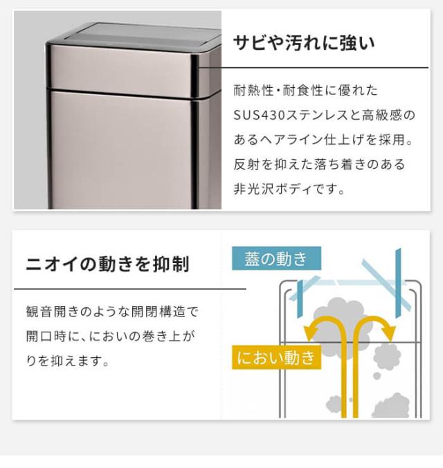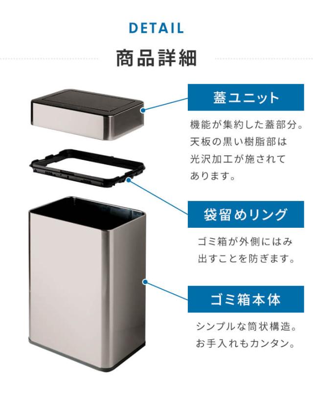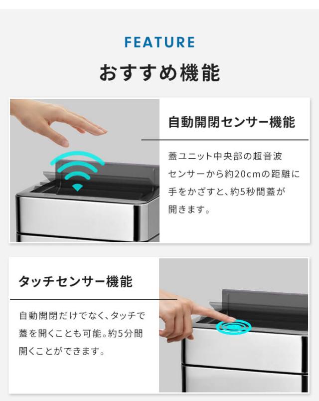 | 究極のシンプルを追求した、オブジェのようなセンサー付きステンレスダストボックス。 <自動開閉センサー搭載(超音波式)> 蓋ユニットの手前中央部にあるセンサーに手をかざすと自動で開口し、約5秒後に蓋が閉まります。 <手動タッチセンサー(開く/閉じる)> 自動開閉センサーの左右に「開く」「閉じる」のタッチセンサーを配置。 「開く」をタッチすると約5分間蓋が開きつづけ、「閉じる」をタッチすると即座に蓋が閉まります。 <ゴミを入れやすい構造> 開口時に手前の蓋が内部に入り込みむためゴミを入れやすい。 <直感的な操作感> 蓋ユニット手前に各種センサー類を配置。どなたでも迷うことなく直感的に操作できます。 <インジゲーターランプ搭載> 開閉時や電池減少時に、蓋ユニット外周を緩やかに灯すインジゲーターランプを搭載。 <バッテリーパック or 単三電池3本で動作可能> 付属のUSB充電式のバッテリーパックまたは、単三電池3本で使用可能。生活スタイルに合わせてご使用いただけます。 <お手入れしやすいシンプル構造> 「蓋ユニット」「袋留めリング」「ゴミ箱本体」からなるシンプルな構造で、お手入れ時に手間がかかりません。 <清潔感を保つうれしい機能性> ・オゾン除菌脱臭機能搭載 ・サビに強いステンレス製(SUS430) ・においの巻き上げを抑える観音開きタイプ <静音設計> 騒音量は約40dB(※1)の非常に静かな開閉音で、寝室でも使いやすい。 (※1 自社調べ、国内メーカーの騒音計を地上高約150cmの位置に設置した際の実測値) <サイズ展開> 生活スタイルに合わせ20L / 30L / 45Lの3種類のサイズ展開をしています。 ※このページは「20L」を販売しております。 |