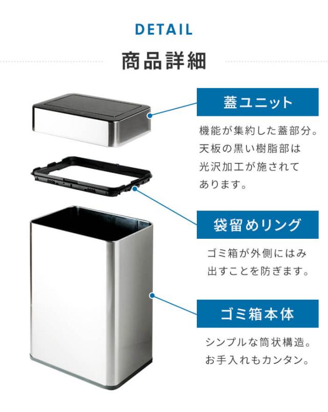 | 究極のシンプルを追求した、オブジェのようなセンサー付きステンレスダストボックス。 <自動開閉センサー搭載(超音波式)> 蓋ユニットの手前中央部にあるセンサーに手をかざすと自動で開口し、約5秒後に蓋が閉まります。 <手動タッチセンサー(開く/閉じる)> 自動開閉センサーの左右に「開く」「閉じる」のタッチセンサーを配置。 「開く」をタッチすると約5分間蓋が開きつづけ、「閉じる」をタッチすると即座に蓋が閉まります。 <ゴミを入れやすい構造> 開口時に手前の蓋が内部に入り込みむためゴミを入れやすい。 <直感的な操作感> 蓋ユニット手前に各種センサー類を配置。どなたでも迷うことなく直感的に操作できます。 <インジゲーターランプ搭載> 開閉時や電池減少時に、蓋ユニット外周を緩やかに灯すインジゲーターランプを搭載。 <バッテリーパック or 単三電池3本で動作可能> 付属のUSB充電式のバッテリーパックまたは、単三電池3本で使用可能。生活スタイルに合わせてご使用いただけます。 <お手入れしやすいシンプル構造> 「蓋ユニット」「袋留めリング」「ゴミ箱本体」からなるシンプルな構造で、お手入れ時に手間がかかりません。 <清潔感を保つうれしい機能性> ・オゾン除菌脱臭機能搭載 ・サビに強いステンレス製(SUS430) ・においの巻き上げを抑える観音開きタイプ <静音設計> 騒音量は約40dB(※1)の非常に静かな開閉音で、寝室でも使いやすい。 (※1 自社調べ、国内メーカーの騒音計を地上高約150cmの位置に設置した際の実測値) <サイズ展開> 生活スタイルに合わせ20L / 30L / 45Lの3種類のサイズ展開をしています。 ※このページは「45L」を販売しております。 |