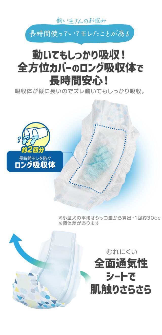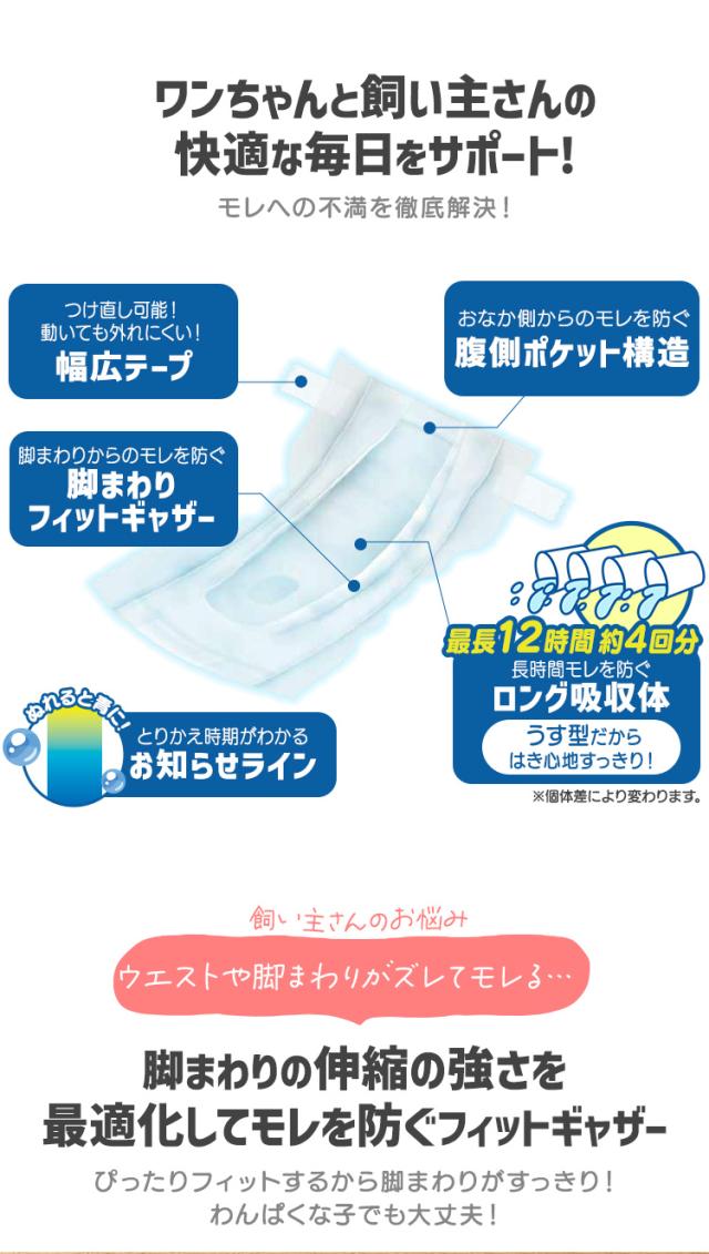 ぴったりフィットでモレにくく、たっぷり吸収設計のペット用おむつ[男の子用]です。