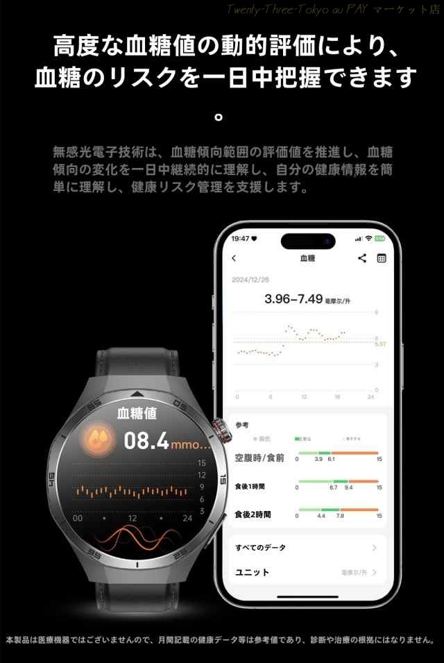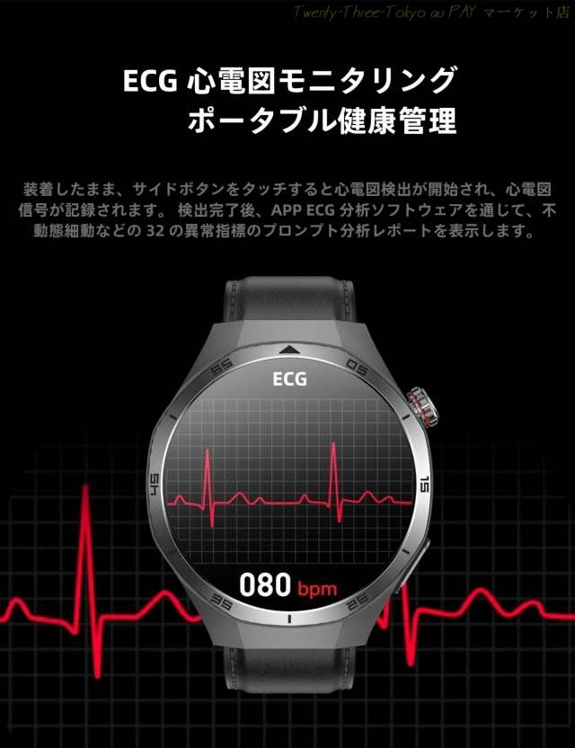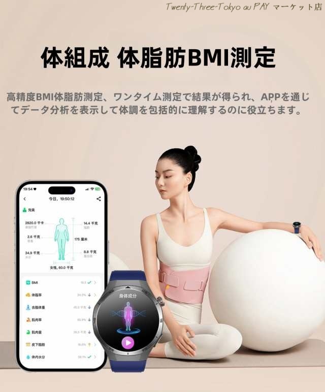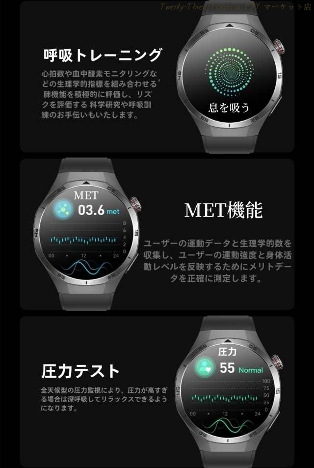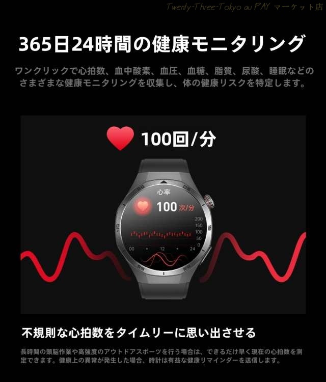 ・健康管理:SOS機能、体組成検査、心電図、体温監視、血圧測定、血中酸素、心拍計、活動量計、歩数計、音楽制御、座りがちの自動注意、睡眠モニター、運動モニター、スポーツ、カメラ操作、カロリー、睡眠の質と時間及び日常生活のさまざまなシーンで測定ができます。