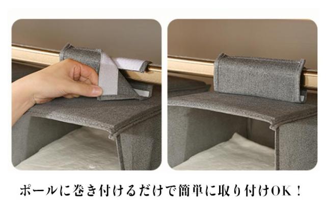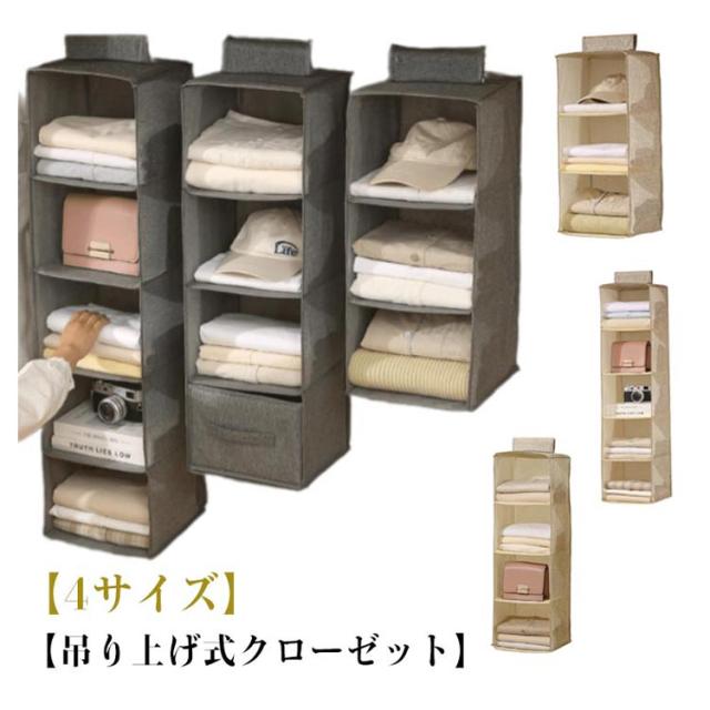 | 【吊り上げ式クローゼット】【4サイズ】【ベージュ・グレー】 クローゼットやハンガーラックのポールに吊るすだけで簡単にタテ置き収納の棚が設置できます。 通気性が良い不織布製なので、カビがつきにくく、やわらかい生地でやさしく保管できます。 棚置き式で、出し入れが簡単にでき、シャツやセーター、帽子などの気になる型くずれを防いで収納できます。 ポールに巻き付けるだけで簡単に取り付けOK! 使わない時は、折りたたんでおけば、かさばらすに省スペースで保管ができます。 | |