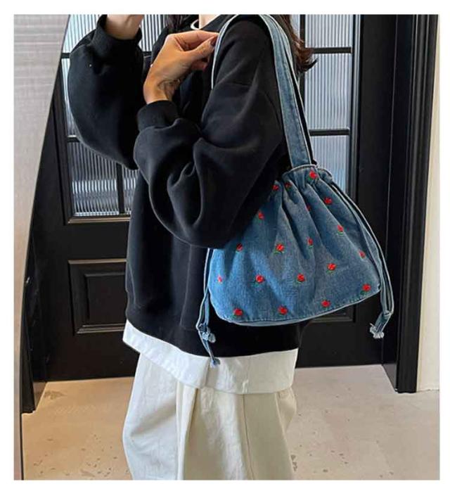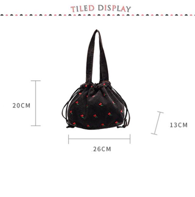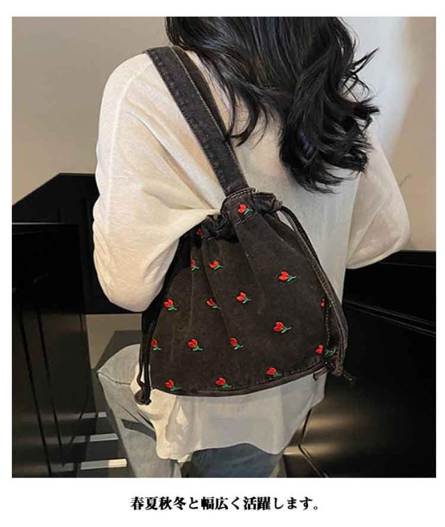 巾着デニムバッグ ショルダーバック ハンドバッグ ミニバック デニム素材 巾着バック 肩掛け 通勤 大容量 軽量 チェリー柄 通学 巾着デニムバッグ 春 夏 秋