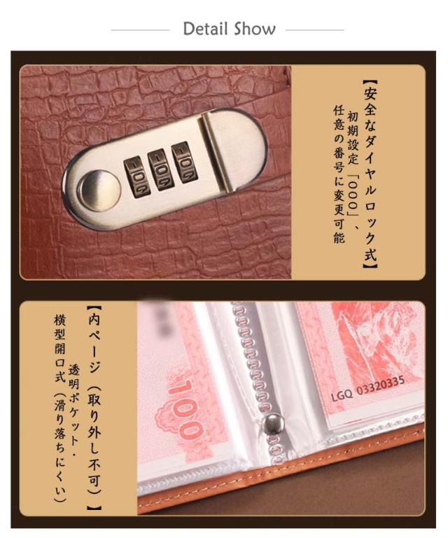 | ダイヤルロック式 貯金バインダー 100枚収納可能 安全なダイヤルロック式:初期設定「000」、任意の番号に変更可能 クロコ調デザイン:レトロでクラシック、上品で高級感のある 大容量収納:紙幣やレシートを100枚まですっきり管理 厚みのある二重レザー:耐摩耗性に優れ、長く愛用可能 便利な透明ポケット:中身が一目で確認でき、取り出しも簡単 内ページ(取り外し不可):透明ポケット・横型開口式(滑り落ちにくい) | |