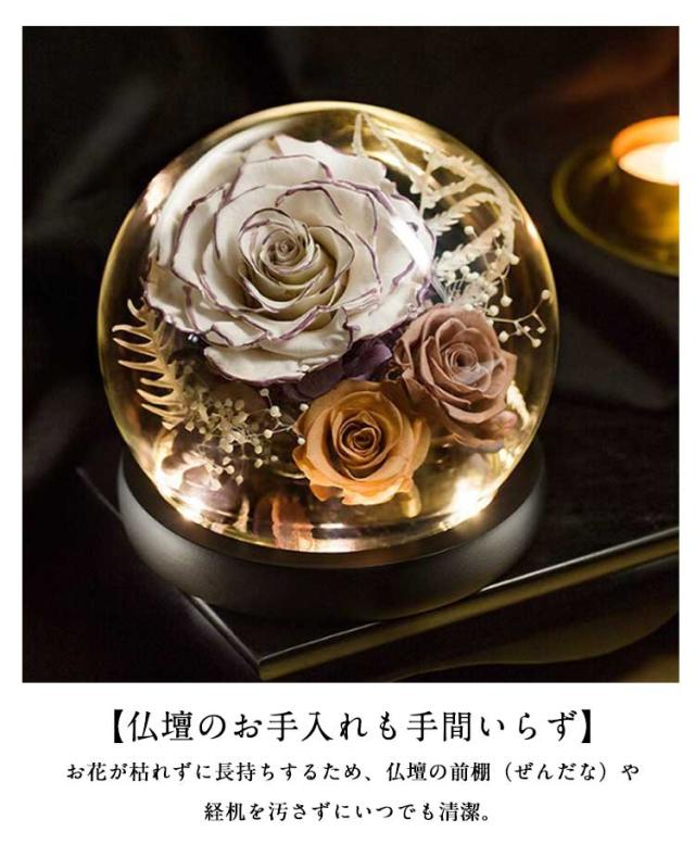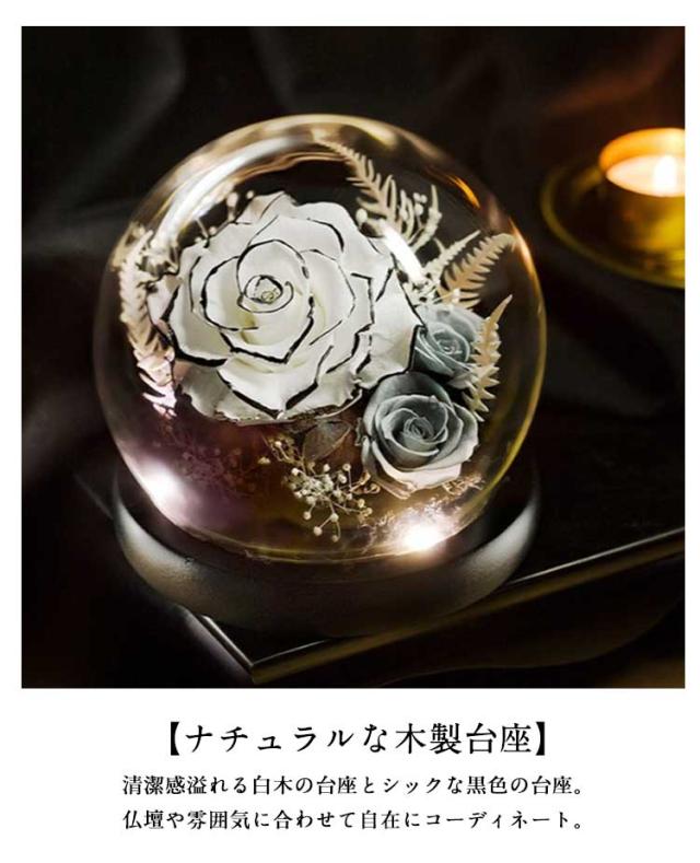 | ボリューム感のあるガラスドーム付きプリザーブドフラワー。 【いつまでも綺麗なお花を捧げたい・・・】・色彩豊かなプリザーブドフラワーをガラス容器に閉じ込めた「ガラスドームアレンジメント」【プリザーブドフラワーって?】・本物の生花を鮮やかな色彩のまま加工したもので、生花より長期間美しさを鑑賞できるのが特徴。 【生花の美しさと質感がそのまま】・季節ごとに咲く花々を、生花のみずみずしい質感はそのままに透明なドームの中にギュッと凝縮。 【水やりやお世話は不要】・ガラスドームで覆われているので、お花がホコリで汚れる心配がなく、水やりや水換えも一切不要。 【仏壇のお手入れも手間いらず】・お花が枯れずに長持ちするため、仏壇の前棚(ぜんだな)や経机を汚さずにいつでも清潔。 【ナチュラルな木製台座】・清潔感溢れる白木の台座とシックな黒色の台座。仏壇や雰囲気に合わせて自在にコーディネート。 【大切な方の好きなお花を】・季節の風物詩を、気持ち華やぐ彩りで。お気に入りの花が凛と咲き誇る、種類豊富なラインナップ。 【故人の面影に寄り添う彩り】・お供えする人の心もホッと安らぐ。故人を偲ぶ気持ちに寄り添う、温もり溢れるアレンジメント。 | |