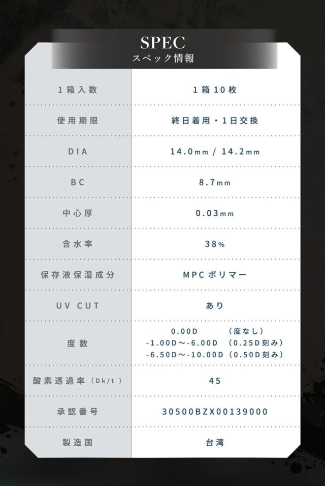 【商品詳細】 ●カラー:ゼロインク ●直径:14.2mm ●着色直径:13.6mm ●ベースカーブ:8.7mm ●含水率:38% ●販売度数:±0.00、-1.00〜-5.75、-6.00〜-10.00 ●付属品:レンズ10枚 ●使用期限:1日使い捨て ●承認番号:30500BZX00139000 【区分】高度管理医療機器 【製造国】台湾 【メーカー名】PIA株式会社 【広告文責】株式会社トクダ TEL:06-6796-7555 【高度管理医療機器販売業許可】 第23N00119号 ■注意事項■ ●コンタクトレンズは高度医療管理機器です。 必ず眼科医の検査・処方を受けてお求めください。 ●商品の欠陥や不良など当社原因による場合には、返品・交換を受け付けさせていただきます。 商品到着後、5日以内にお電話ください。 なお、衛生用品の為、お客様都合による返品・交換は受け付けておりませんので、ご了承ください。 ●当店では、コンタクトレンズに関しまして、ご注文確定後のキャンセルは承っておりません。 ●商品の発送目安は、各商品ページにあります【配送予定】をご参考くださいませ。 |