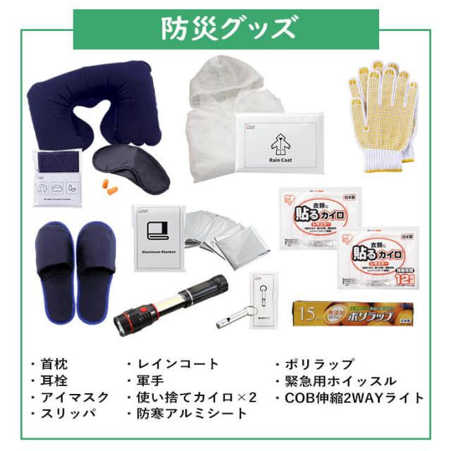 避難用リュックバッグ、キャリーカート、COB伸縮2WAYライト、ホイッスル、非常用トイレ1P(1回分)×4、防寒アルミシート、ウェットティッシュ×2、軍手、使い捨てカイロ×2、防寒レインコート、絆創膏(大小×各2)、ポケットティッシュ×2、ペーパー歯磨き5P、ウェット手袋(シャンプー手袋)、スーパーロングウェットボディタオル、不織布マスク×2、スリッパ、首枕、耳栓、アイマスク、ポリラップ、備蓄用飲料水500ml×2、ライスクッキー(※アレルギー物質28品目不使用)×2 、長期保存用ボディタオル