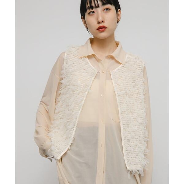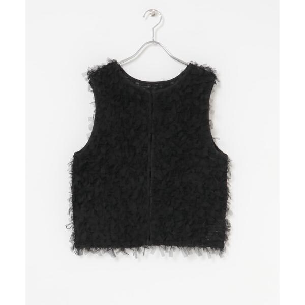 リボンチュールを全体的に施した、存在感を放つベスト。コンパクトなサイズ感になっており、カットソーやタンクトップにレイヤードするだけで新鮮なスタイリングが楽しめます。フロント釦はシーム仕様になっているので、ブラウスのようにも着ていただけます。