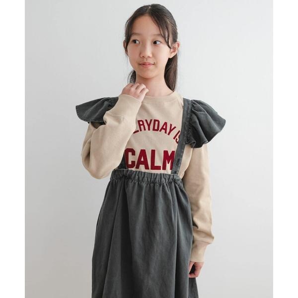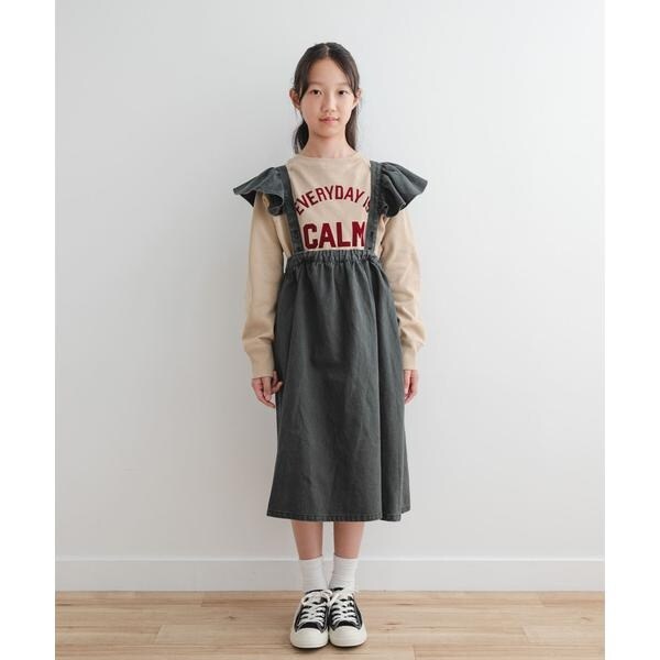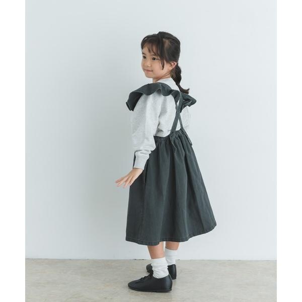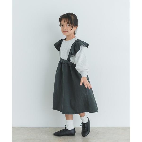デニム調のツイル素材でお作りした、ジャンパースカートが登場。肩紐を外せばスカートとしても着れる2way仕様で、気分によって変えれるのが魅力。程よいハイウエストデザインでバランスが取りやすく、カジュアルな素材で甘すぎない肩紐のフリルがポイント。肩紐の長さもボタン調整可能で、お子様の成長に合わせて長く着用いただけます。夏はTシャツやノースリーブで、秋にはリブタートルなど幅広く合わせていただけるシーズンレスなアイテムです。