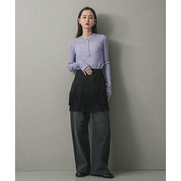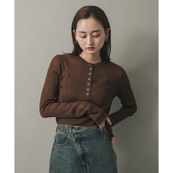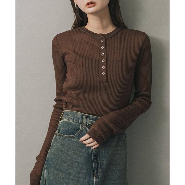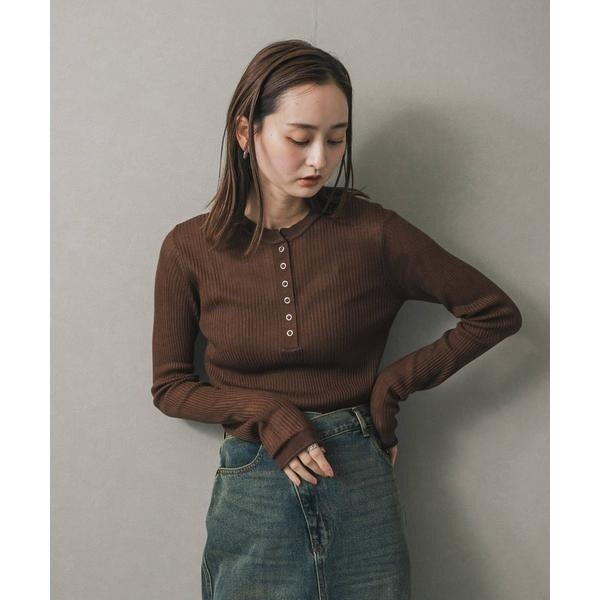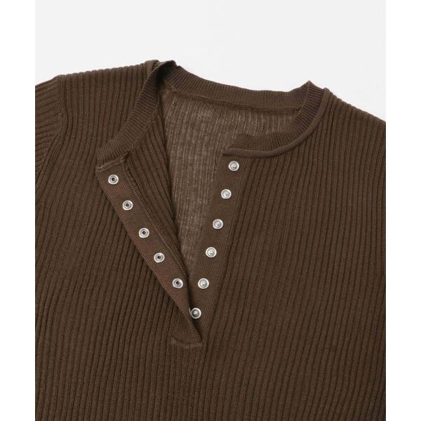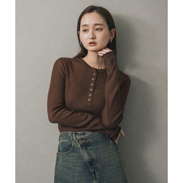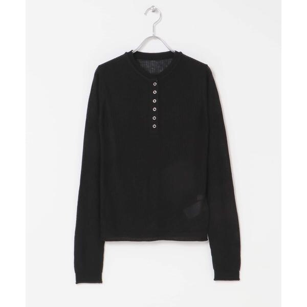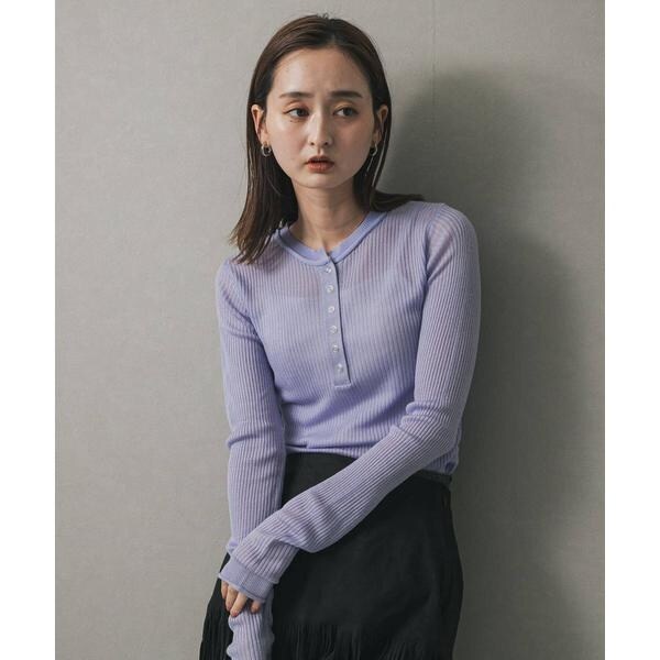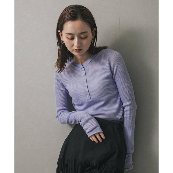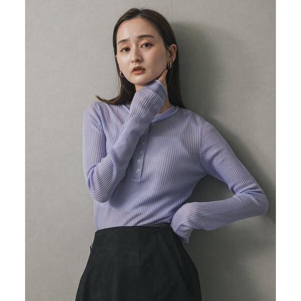 程よいシアー感が大人っぽさを引き立てる、ヘンリーネックセーター。華奢なリングドットボタンが可愛らしいアクセントになり、洗練された印象を与えます。