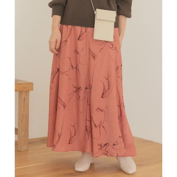 全体に生地と同系色のマーブルプリントを施したロング丈のフレアスカート。柄物ながらも落ち着きのある印象で、大人っぽく着用いただける1着◎ウエストは総ゴムなので、クリーンな見た目ながらも非常に楽な穿き心地が嬉しいポイント♪歩くたびにふわっと揺れるフレアデザインが可愛いオススメのスカートです。