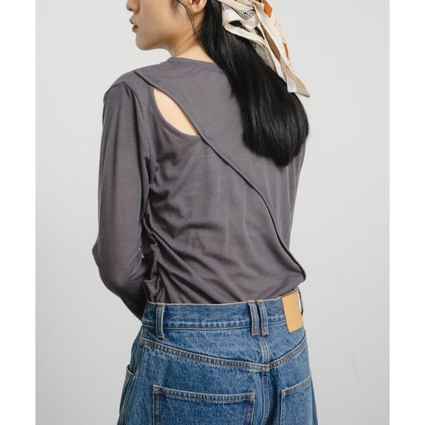 一見シンプルなロンTEEに見えますが、程よく透け感のあるリブが女性らしい印象を与えてくれるカットソー。バックスタイルには、一癖のあるデザインを施しており、肩のカットアウトはさりげない肌見せを叶えます。メイン使いはもちろん、インナーにも着回せる1着です。