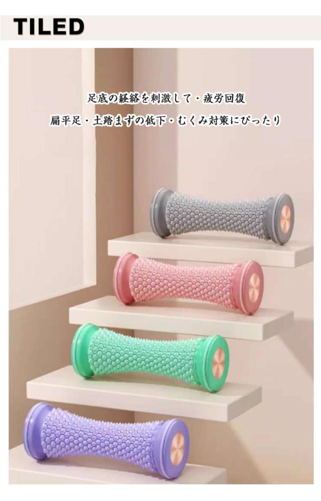 | 足裏マッサージ用 フットローラー 2本セット 足底の経絡を刺激して・疲労回復 扁平足・土踏まずの低下・むくみ対策にぴったり! 足裏・足弓・踵・ふくらはぎまで全方位ケア コロコロ転がすだけで手軽にマッサージ♪ 運動後の筋膜リリースや足部リハビリにも◎ 高弾力TPRでやさしくフィット、使うたびスッキリリフレッシュ! オフィスのデスク下でコロコロ、テレワーク中におうちでコロコロ。 おしゃれでかわいいデザインなのでどんな場所でも使える。使い勝手の良い足裏マッサージローラー。 誕生日 はもちろん 母の日 父の日 敬老の日 に、 健康グッズ の プレゼント ギフト としても最適です。 | |