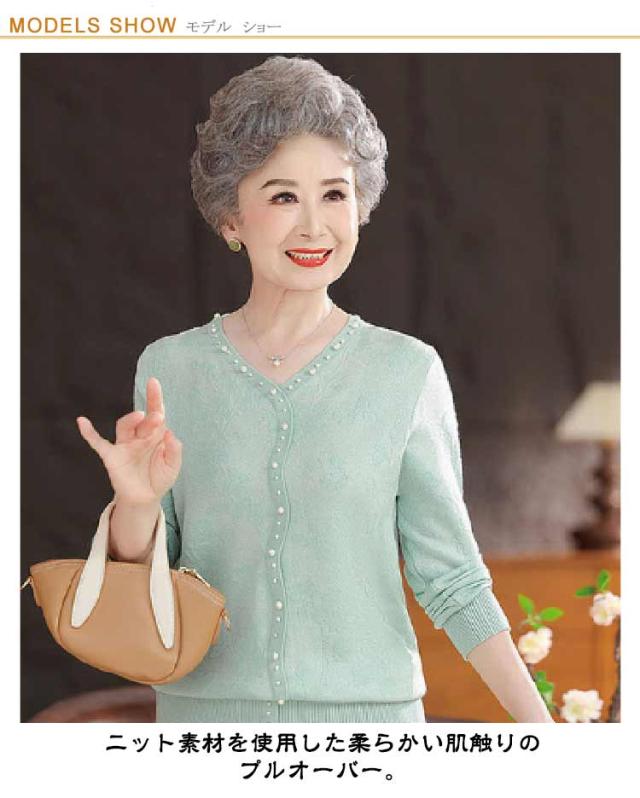70代 ニットセーター Vネック シニアファッション ニットプルオーバー 80代 レディース 長袖 ニットトップス 50代 春 秋 婦人服 おしゃれ 60代 お誕生日 無地 上品 シニアファッション 敬老の日 プレゼント パール付き ギフト ミセス 祖母 おばあちゃん お年寄り 高齢者 老人